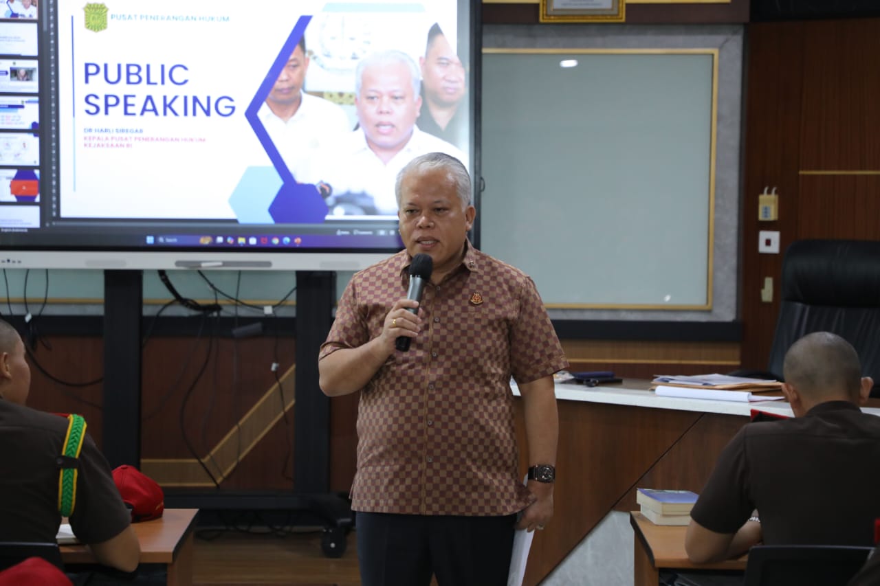 Kepada siswa pendidikan pembentukan jaksa, Dr.Harli Siregar menyampaikan materi tentang Public Speaking atau Komunikasi Publik.
