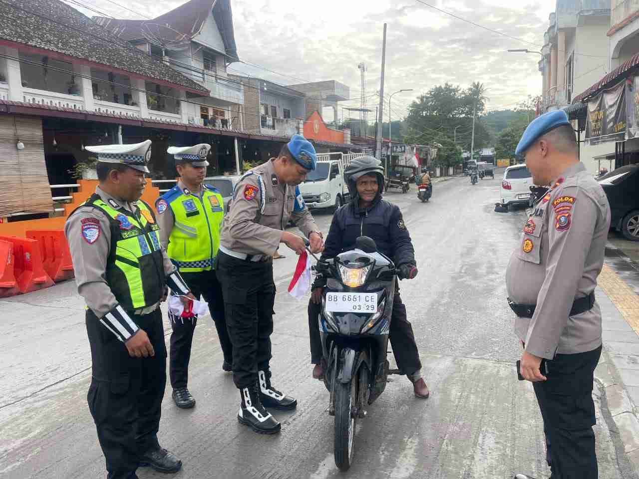 Dipimpin Kasi Propam Polres Samosir, IPDA Darmono Samosir, S.H, kegiatan ini berlangsung Senin pagi (11/08/2025), di mana sebanyak 50 lembar bendera kecil dibagikan dan dipasang langsung di kendaraan yang melintas.
